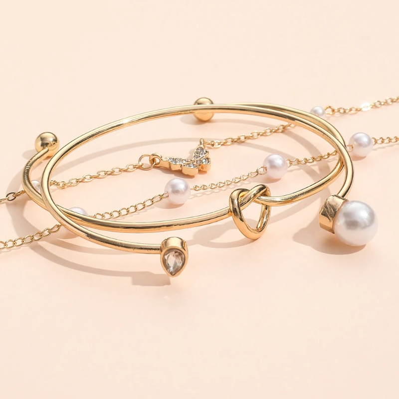 Classic Pearl Rhinestone Butterfly Bracelet for Women (4 Pcs)