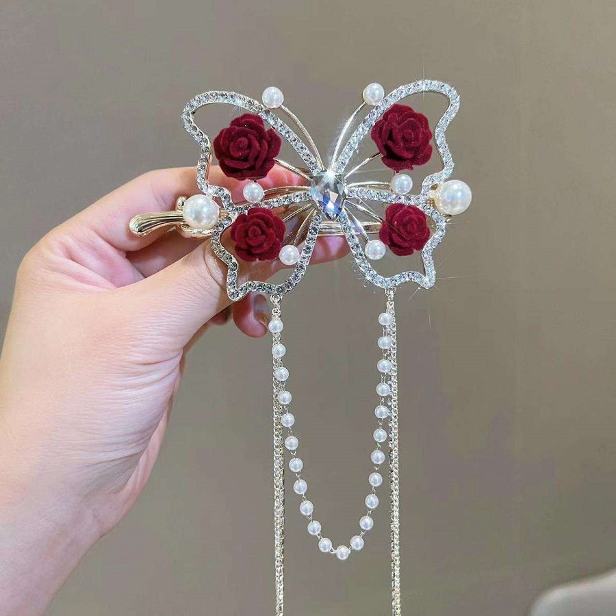 Rose Butterfly Pearl Tassel Hair Clip